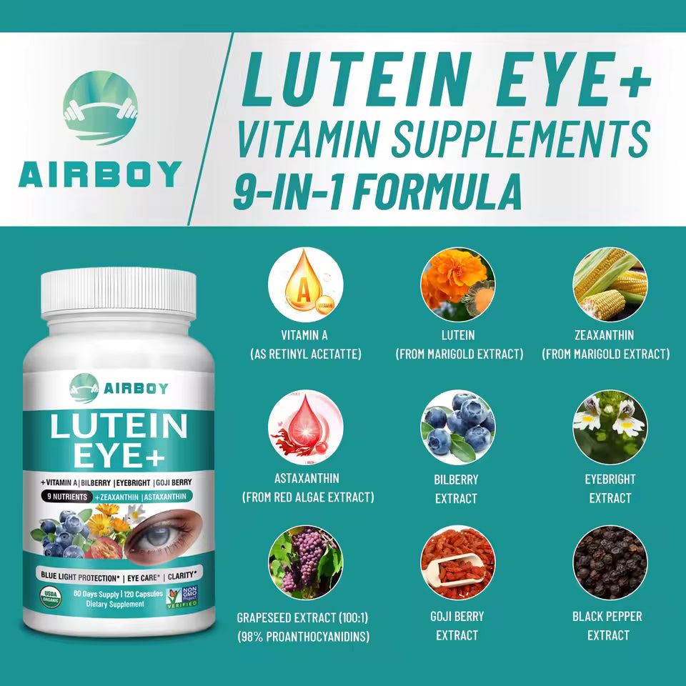 Lutein Eye + Vitamin Supplement - 9-in-1 Formula with 5:1 Ratio Zeaxanthin, Astaxanthin, Eyebright, Bilberry Vitamin A, Goji Berry, Grape Seed Extract - Enhanced Absorption, Improved Contrast, Fine Detail, Eye Health - Supports Healthy Lens, Macula, Retina, Night Vision - Relieves Blue Light, Aging, Fatigue, Dry Eyes - Made in the USA (120 Vegetarian Capsules)